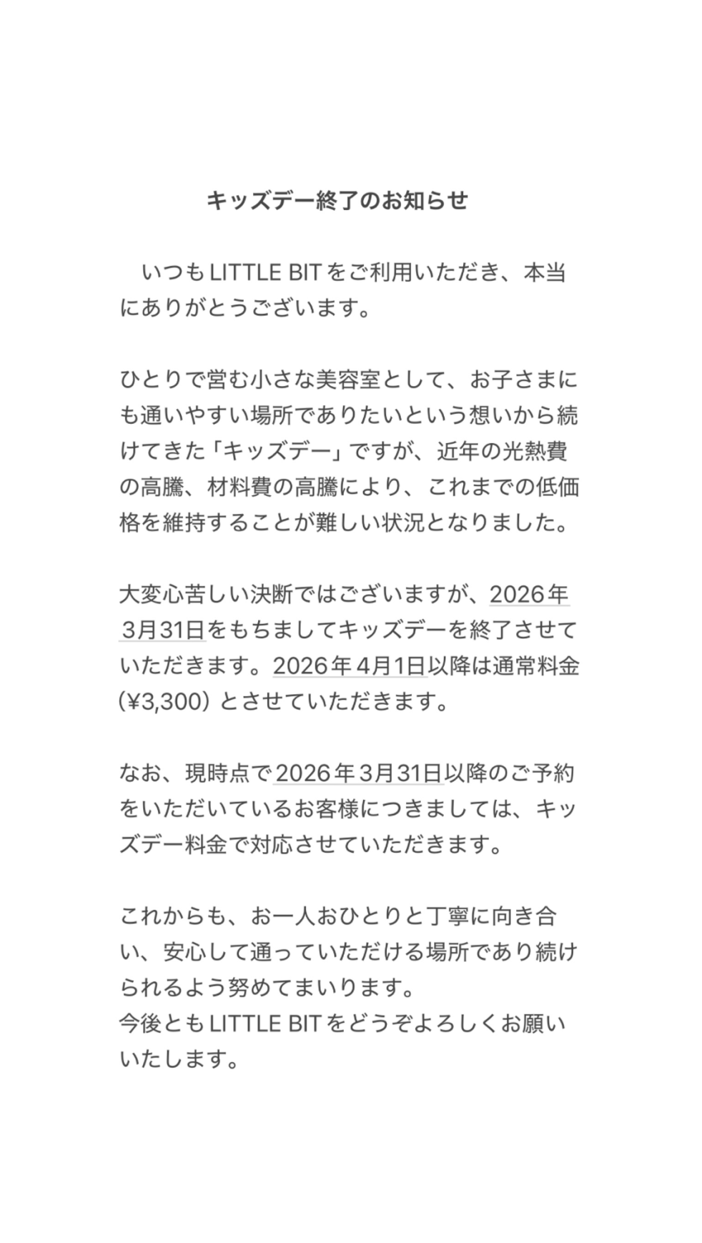 いつもLITTLE BITをご利用いただき、本当にありがとうございます。 ひとりで営む小さな美容室として、お… キッズデー終了のお知らせ の続きを読む