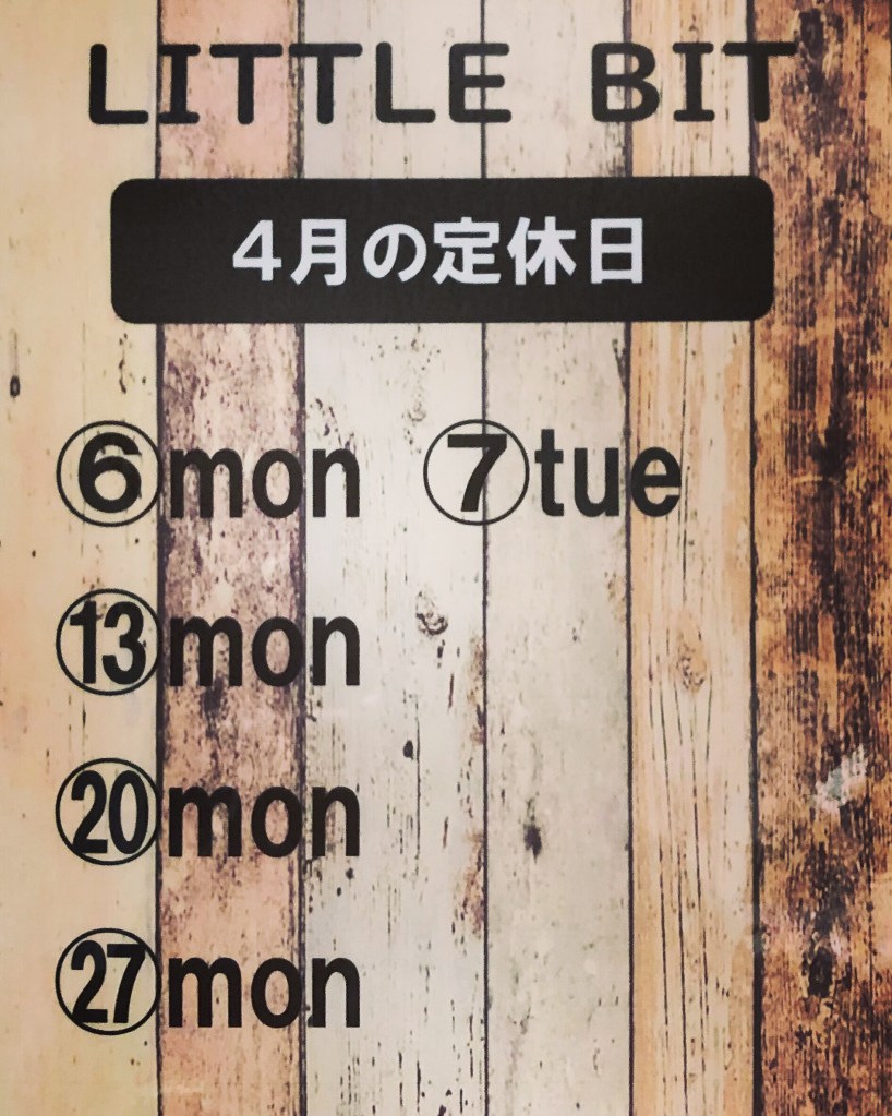 では、4月の定休日です。さっそくですが、6日、7日は連休になります。