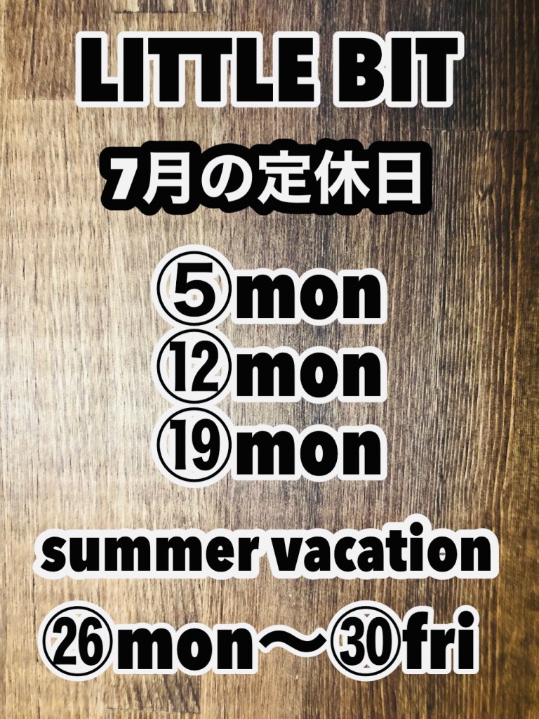 では、7月の定休日です。今月末に少し早いですが、夏休みを頂きます。ご迷惑をおかけしますが、よろしくお願い致します。