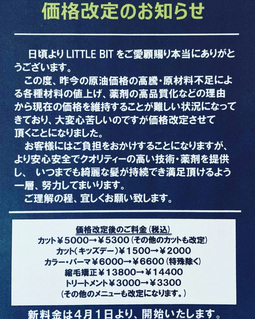 この度、昨今の原油価格高騰・原材料不足による各種材料の値上げ、薬剤の高品質化などの理由から現在の価格を維持することが難しい状況になってきており、大変心苦しいのですが価格改定させて頂く事になりました。