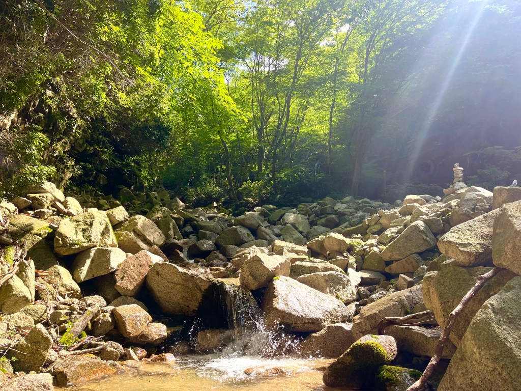 庵座谷ルートは開始から沢沿いをあるくので、涼しくてめちゃくちゃ気持ちいいです!ただ、唯一の心配はこの時期にいる山蛭(山ヒル)😱吸われると血が止まらないとか…。一抹の不安を抱きながら山行は続きます。