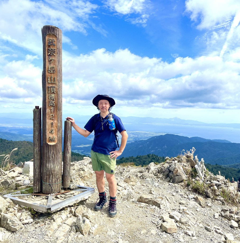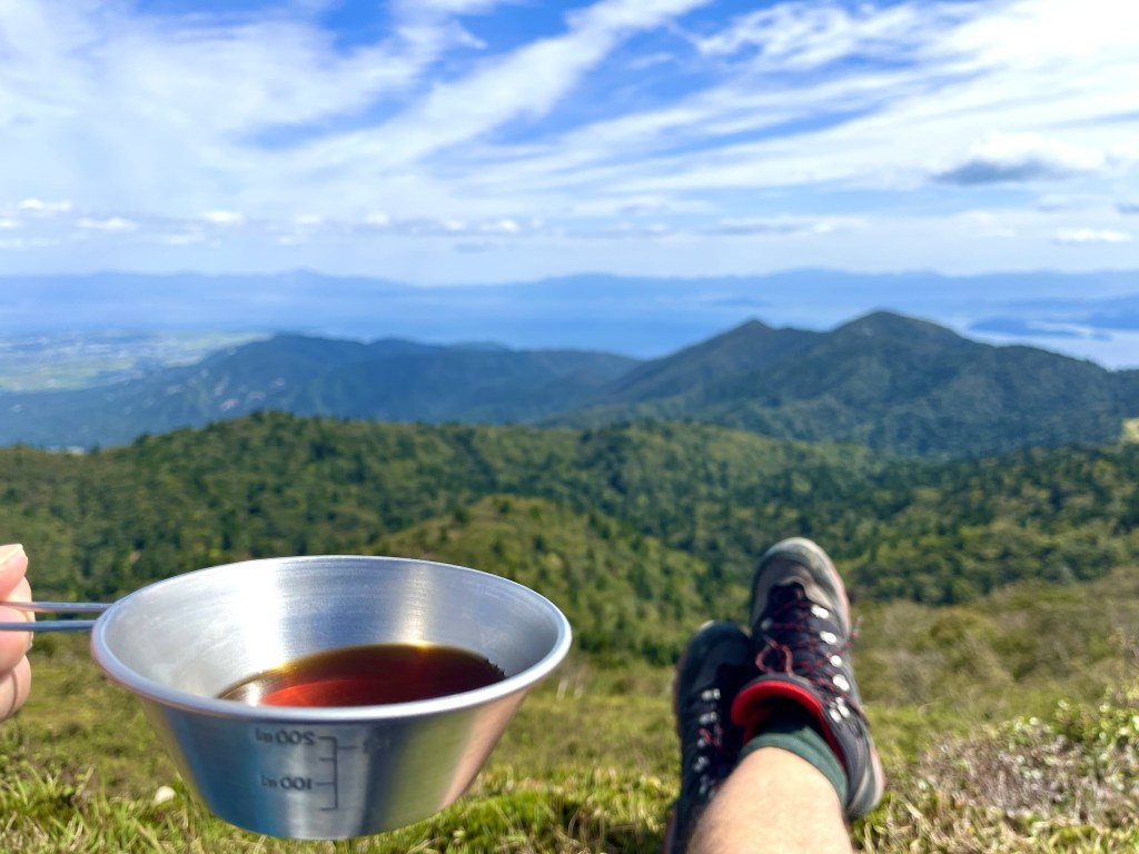 山頂は風が強く寒さを感じるので、少し離れた岩に隠れて昼食です🤗ゆっくり座るその先には雄大な琵琶湖が広がっています。