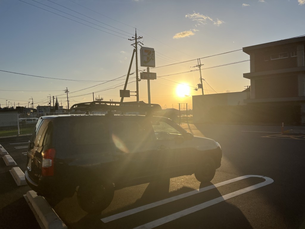 お昼ご飯を買いに比良駅近くのコンビニで買い出しです。6時30分、朝陽が眩しいですね。