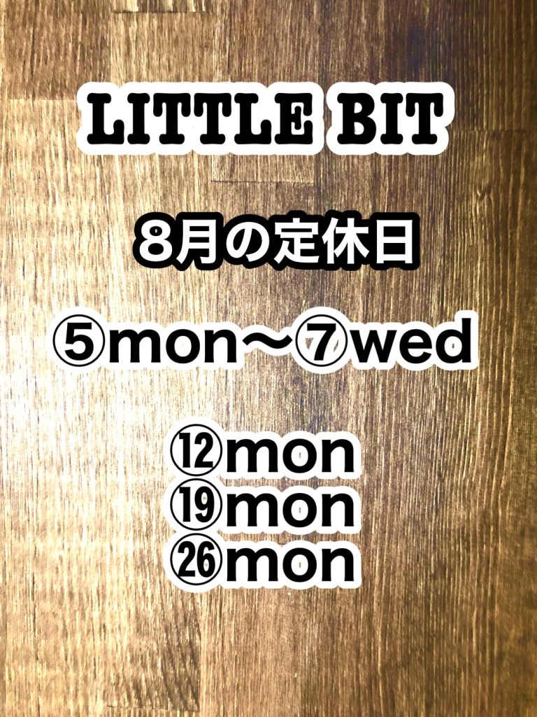 では、8月の定休日です。8月は最初の週に3連休がありますが、お盆時期は営業致します。ご確認よろしくお願い致します。